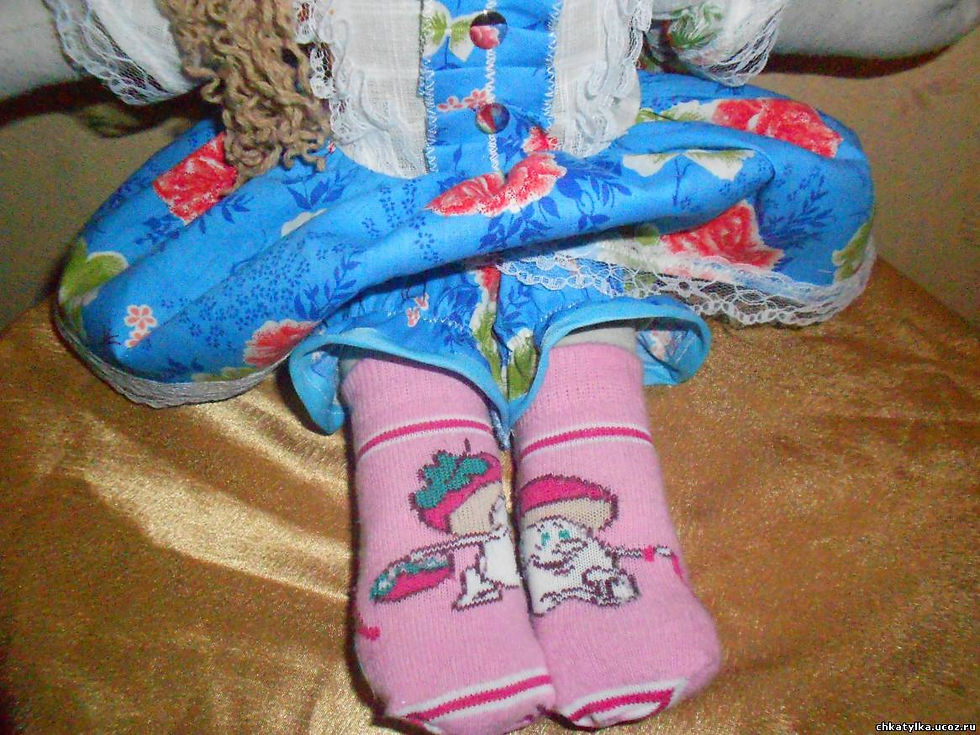 Тельце цельнокроеное наполнено халлофайбером (единственный материал не натуральный, но не вызывает аллергии). Голова сделана из шерстяного полотна и вовнутрь добавлен шерстяной клубок заменяющий мозг. Глазки и ротик вышиты нитью мулине. Волосы прошиты по всей голове из шерстяной нити, можно заплетать косы. Гардероб состоит из панталончиков и платья- все снимается и можно стирать на руках. на ножках носочки.